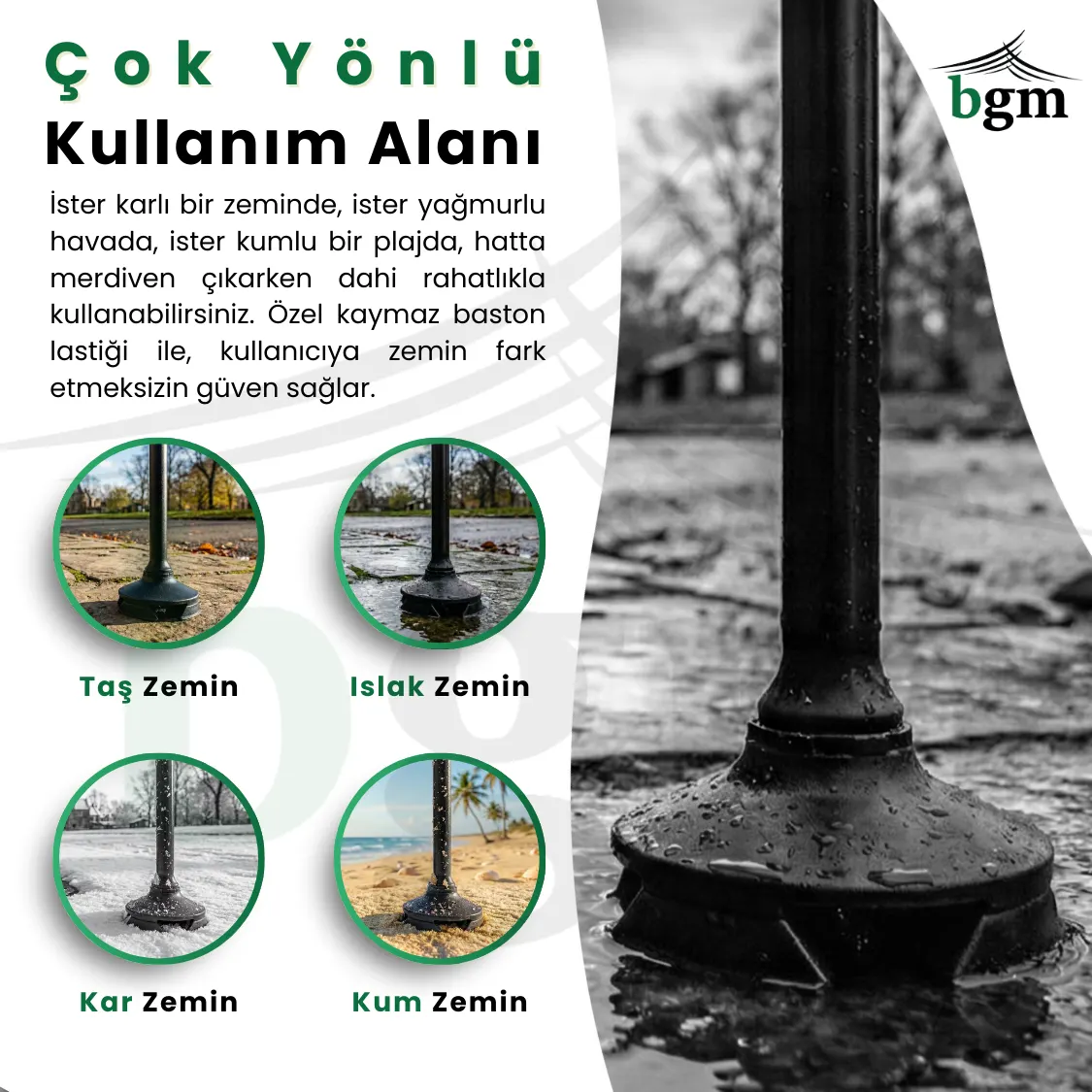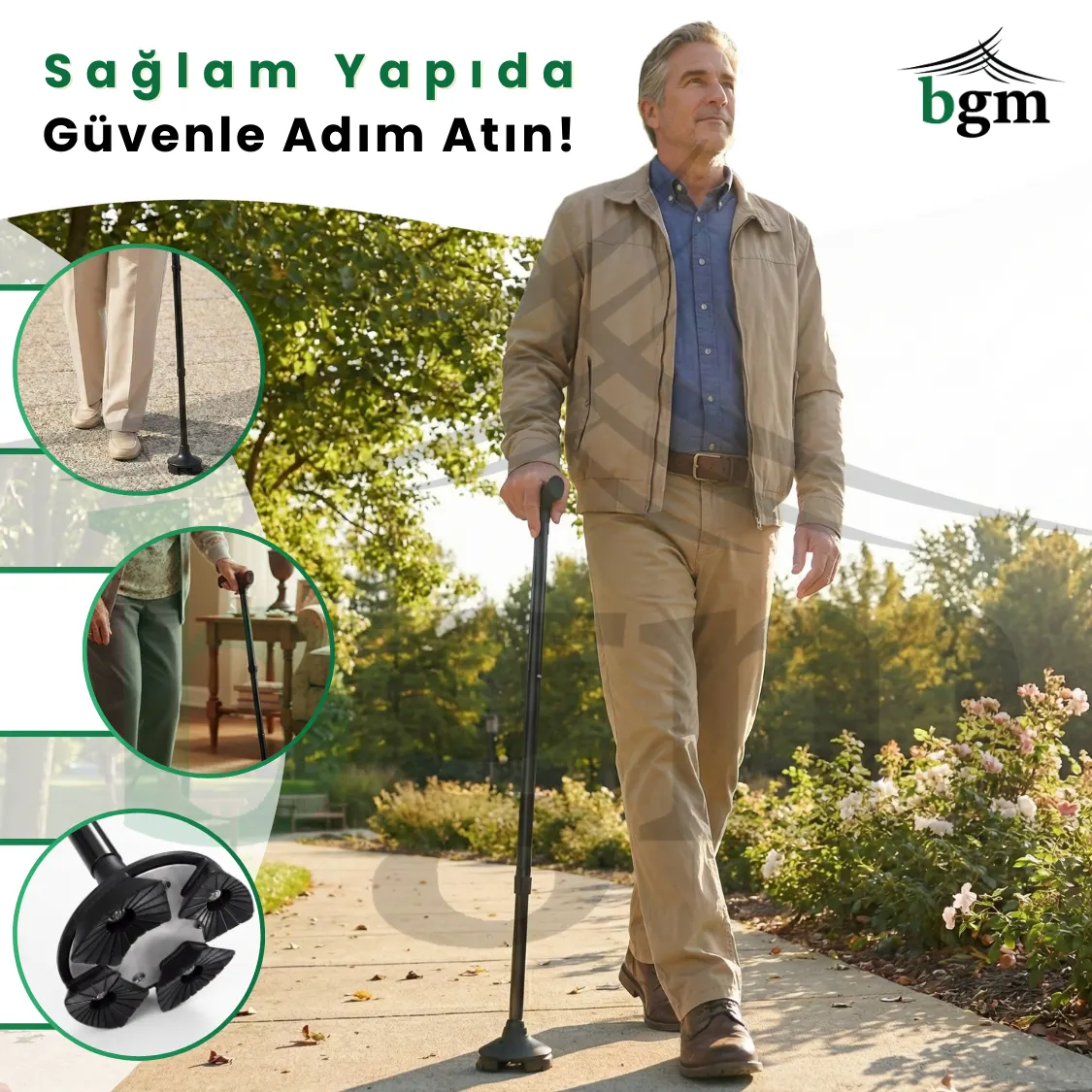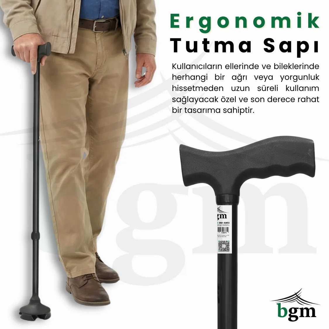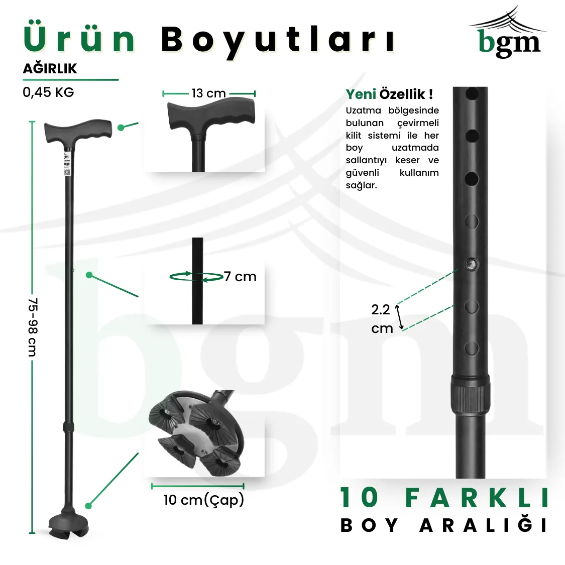 Günlük yürüyüşlerde ekstra denge ve güven arayan kullanıcılar için tasarlanmış hafif, sağlam ve şık bir yardımcı: BGM Siyah Akıllı Denge Bastonu. Alüminyum gövdesi sayesinde yalnızca ~0,45 kg ağırlığındadır; 76–98 cm arası yükseklik ayarı ile farklı boylardaki kullanıcılar için kişiselleştirilebilir. Geniş yüzeyli hareketli, kaymaz kauçuk uç (≈ 10 cm) farklı zeminlerde tutuşu artırır; 13 cm ergonomik tutma sapı elde konforlu kavrama sağlar.