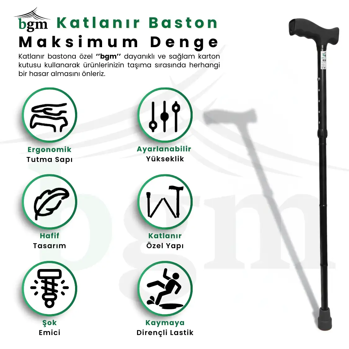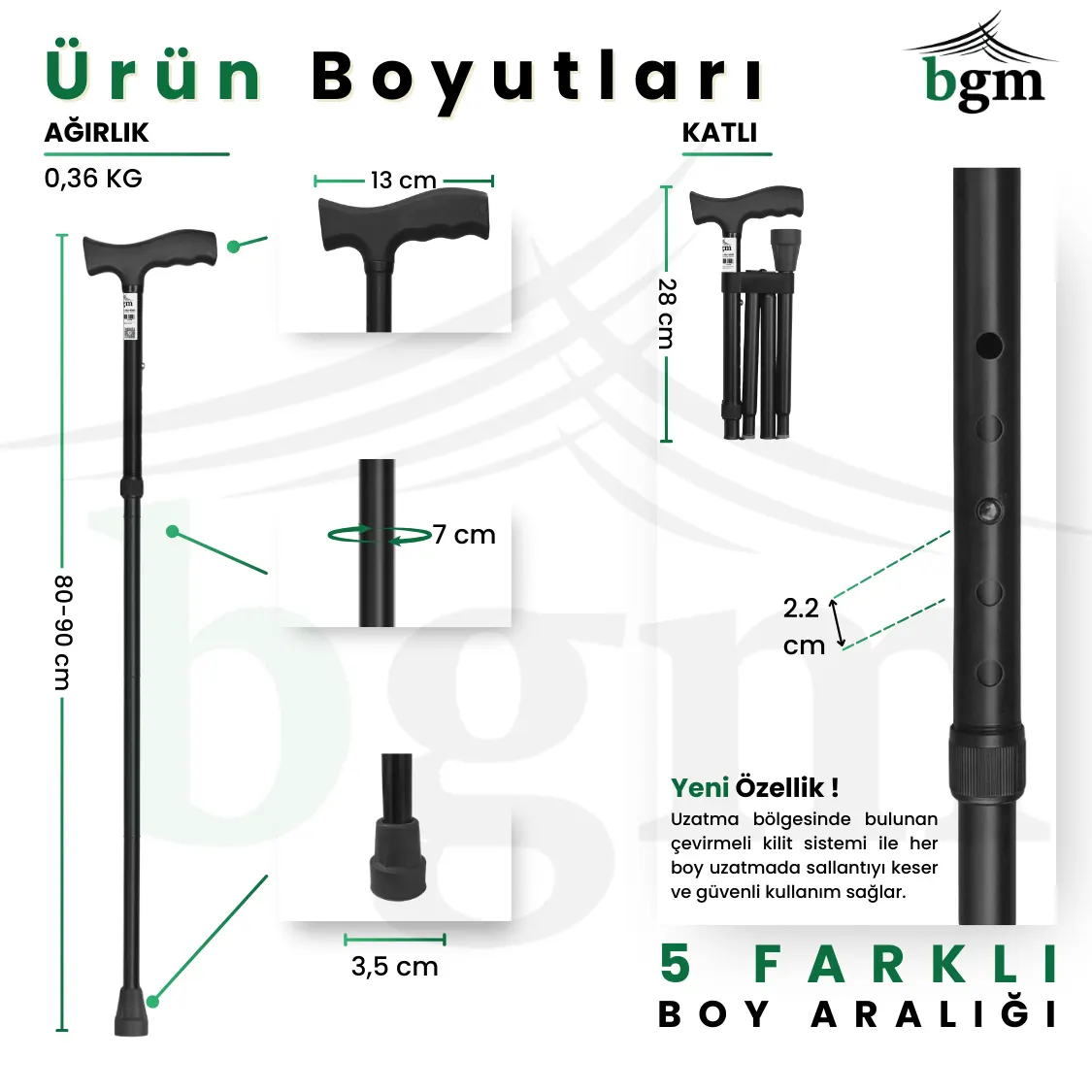 - Kutu İçeriği: Katlanabilir ayarlı baston, sabitleme klipsi, takılı kauçuk pabuç, kısa kullanım kılavuzu.