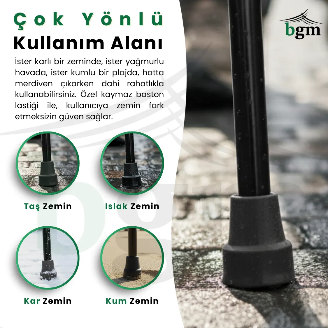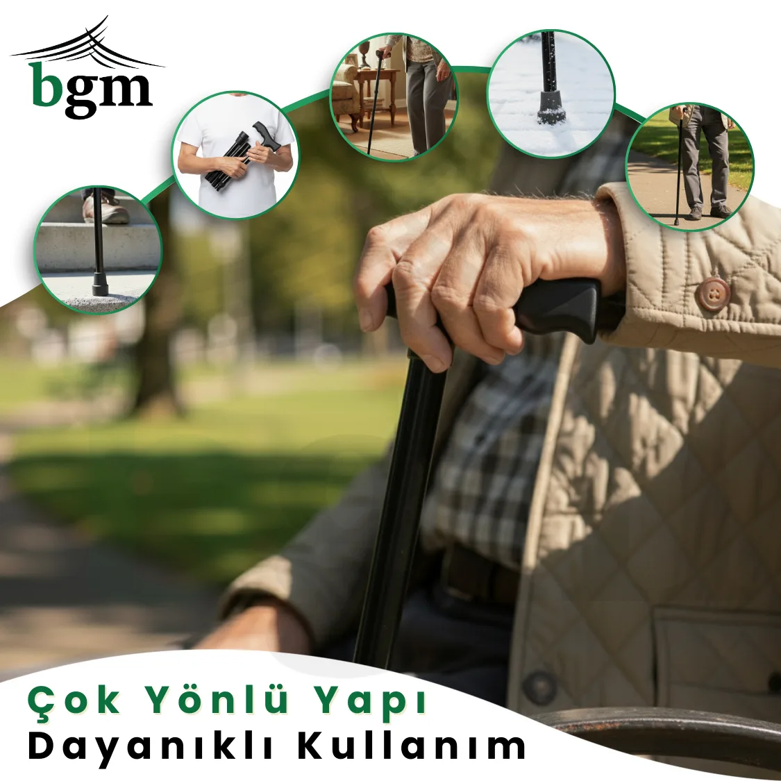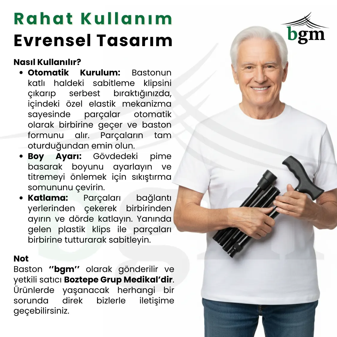 Uyarı: Baston bir denge yardımcısıdır; vücut ağırlığının tamamını taşımak için tasarlanmamıştır.