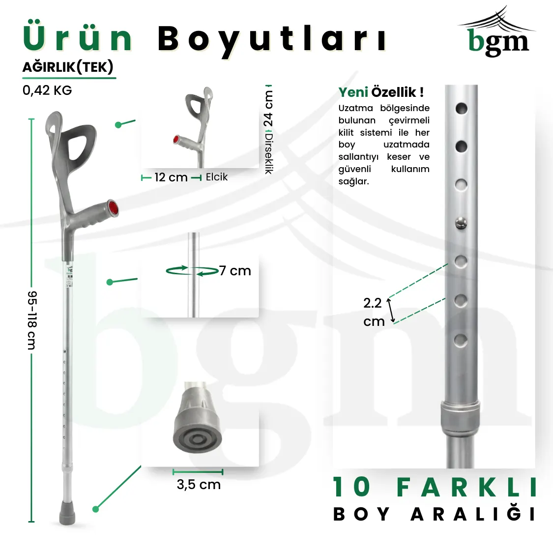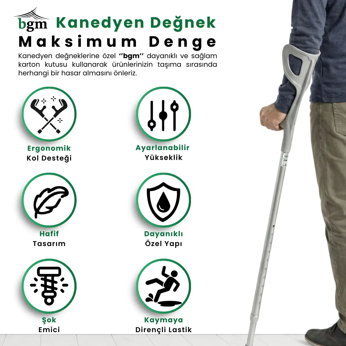 Yürüme desteğine ihtiyaç duyan kullanıcılar için geliştirilen BGM kanedyen değnek; hafif alüminyum gövde, ergonomik el tutamağı, dirsek manşonlu kol desteği ve kaymaz kauçuk pabuç ile maksimum denge ve konfor sağlar. 10 kademeli yükseklik ayarı (yaklaşık 95–118 cm) ve çevirmeli kilitli teleskopik sistem sayesinde boyunuza tam uyar, sallantıyı azaltır ve sessiz, güvenli kullanım sunar.
